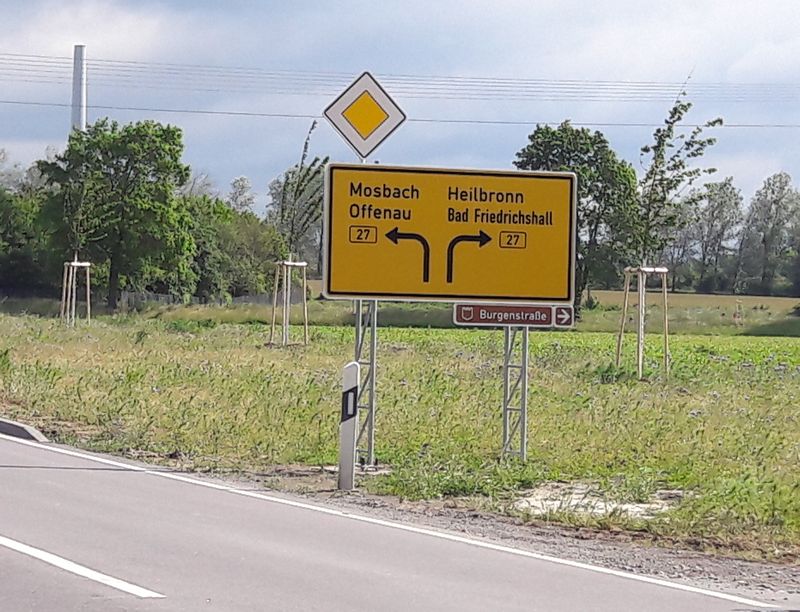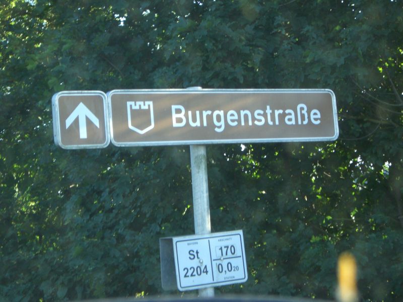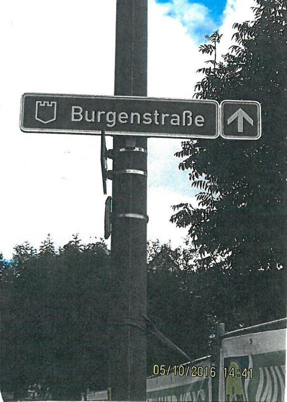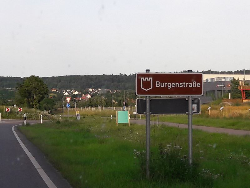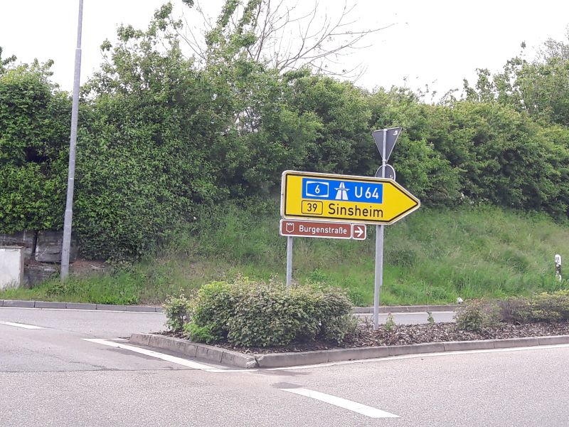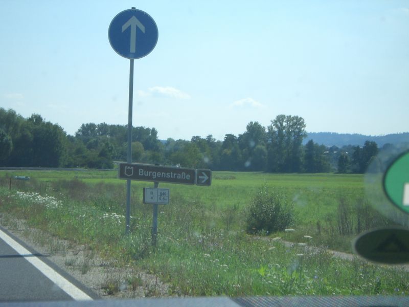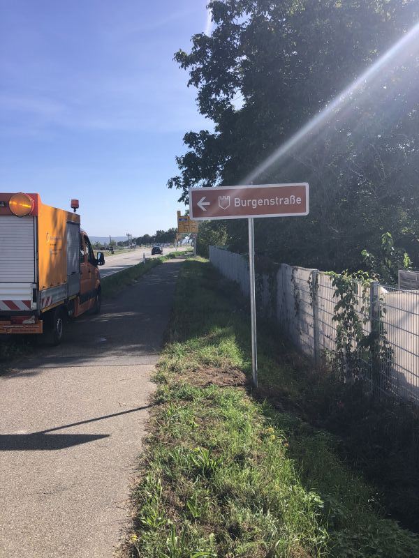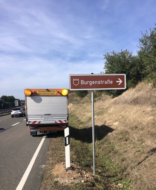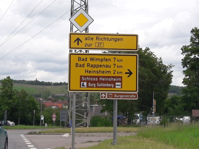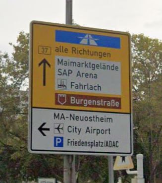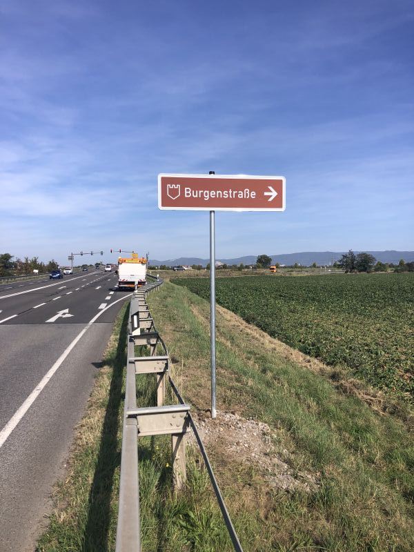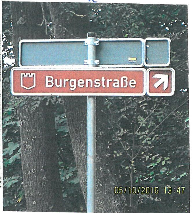 Aufstellung: AUSTAUSCHEN Standort: Bismarckstraße, Bereich vor Barockschloss Mannheim, Startschild Burgenstraße Pfeil: GERADEAUS (kann bleiben) Bereisung: 25.06.2017 Großes Schild, Richtung Nürnberg, mit Linkspfeil Kreuzung der Straße aus Edingen-Neckarhausen mit B 37 nach Heidelberg