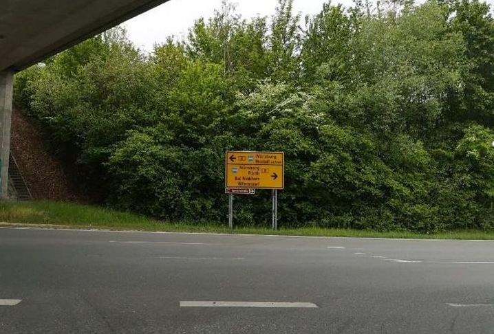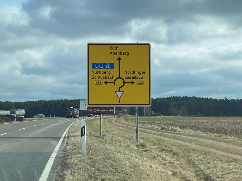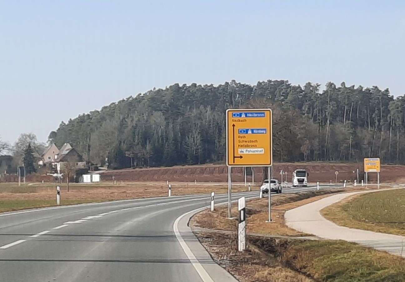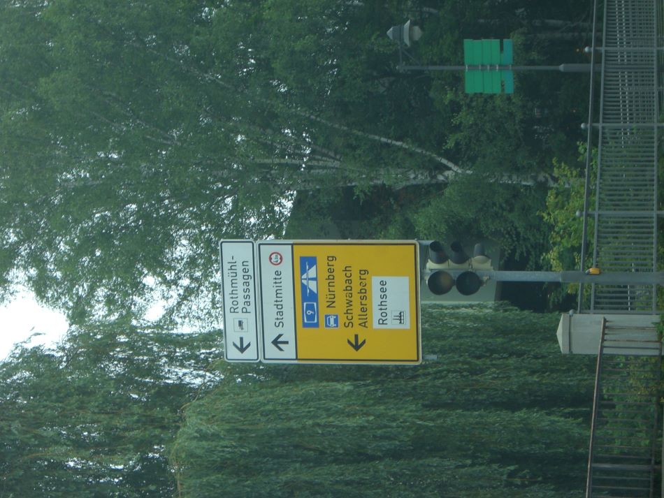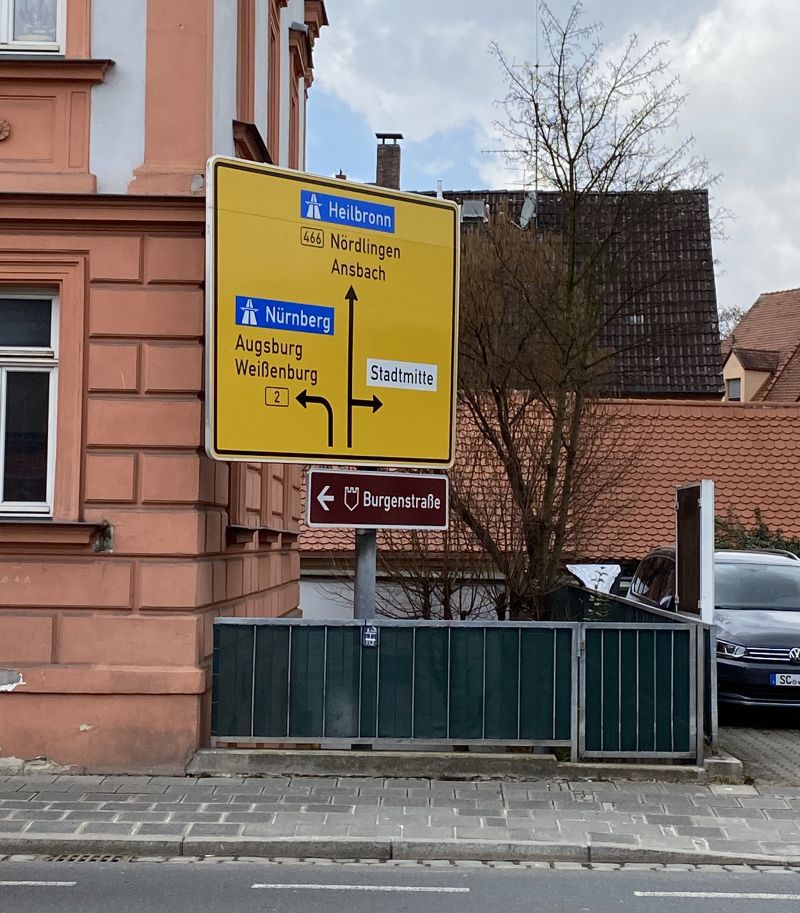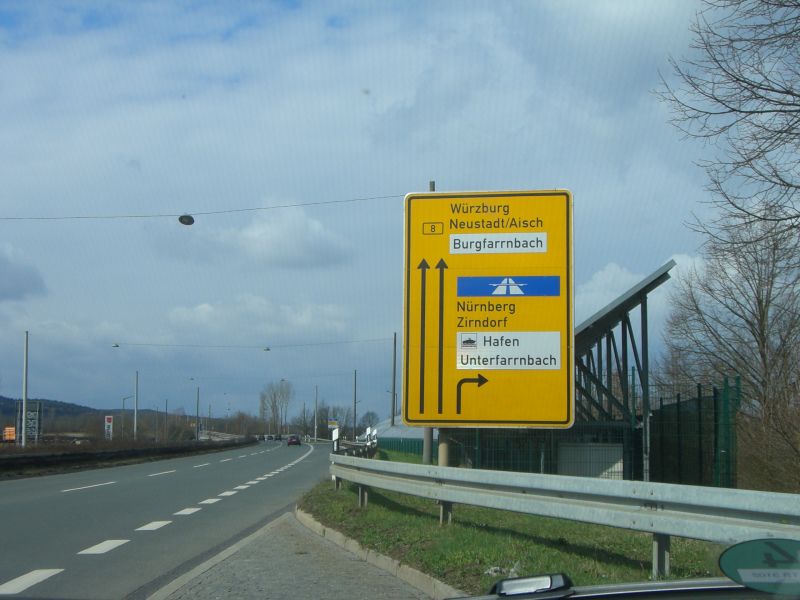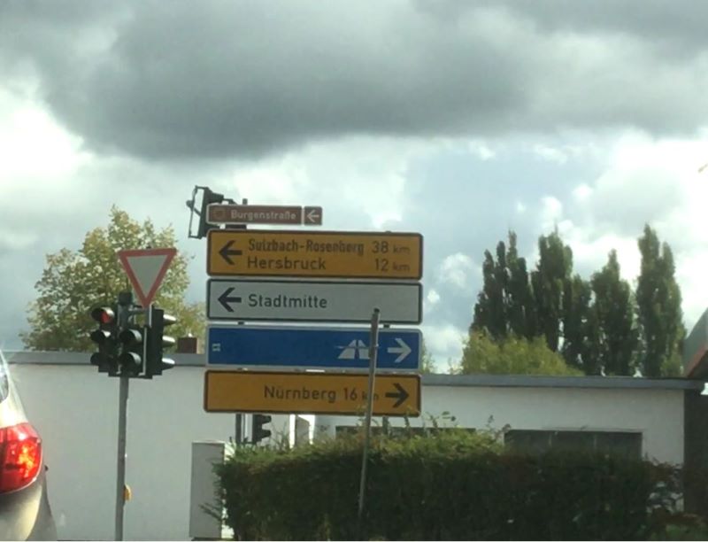 Großes Schild, Richtung Nürnberg, mit Linkspfeil