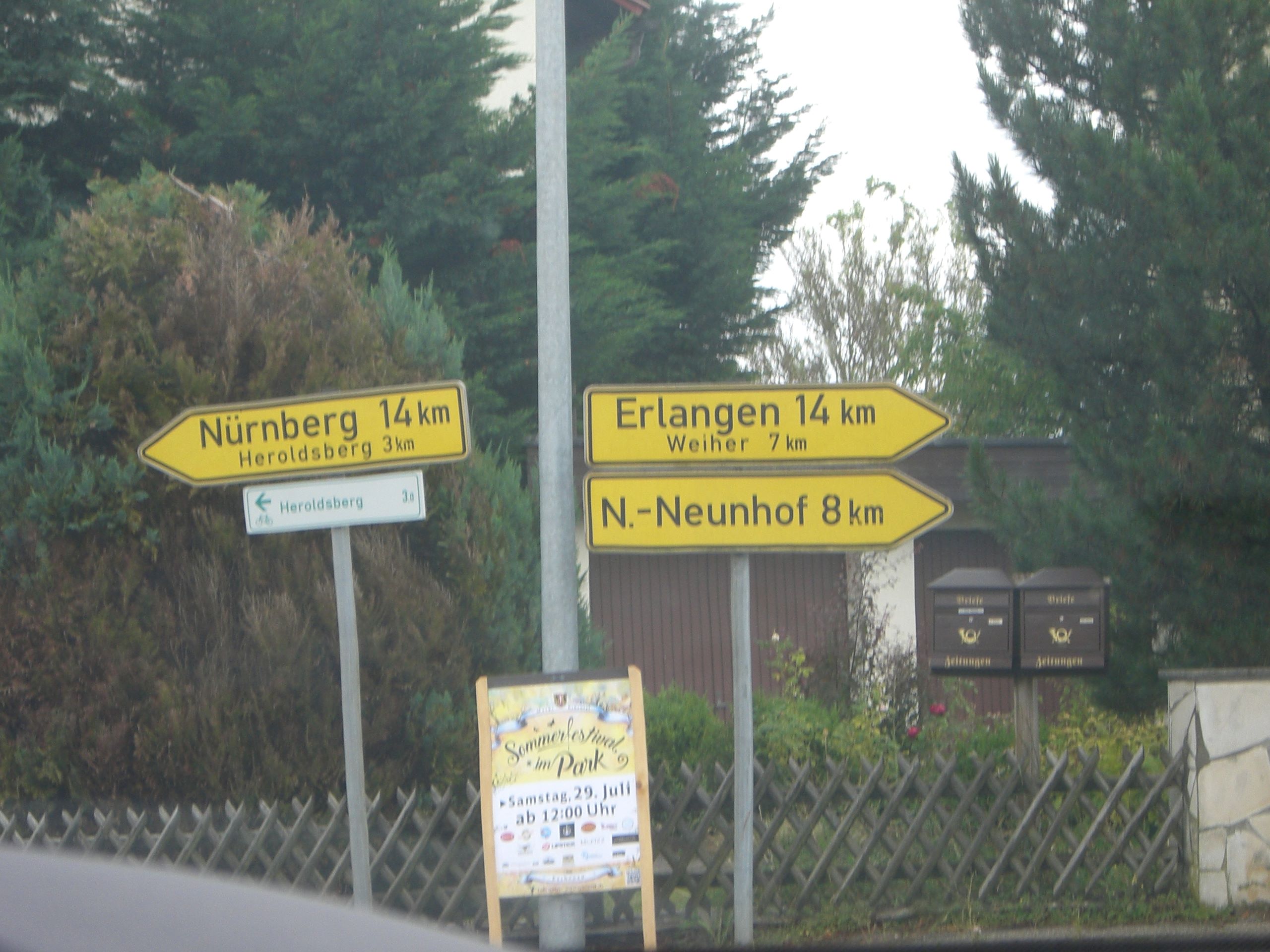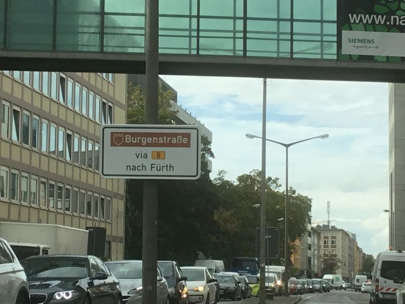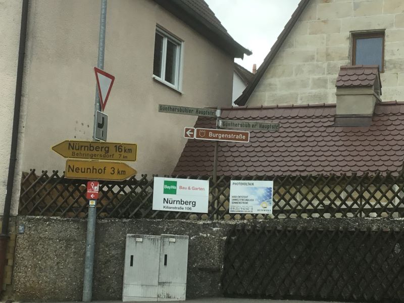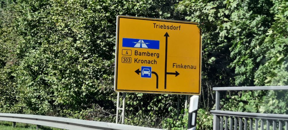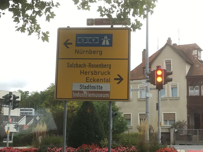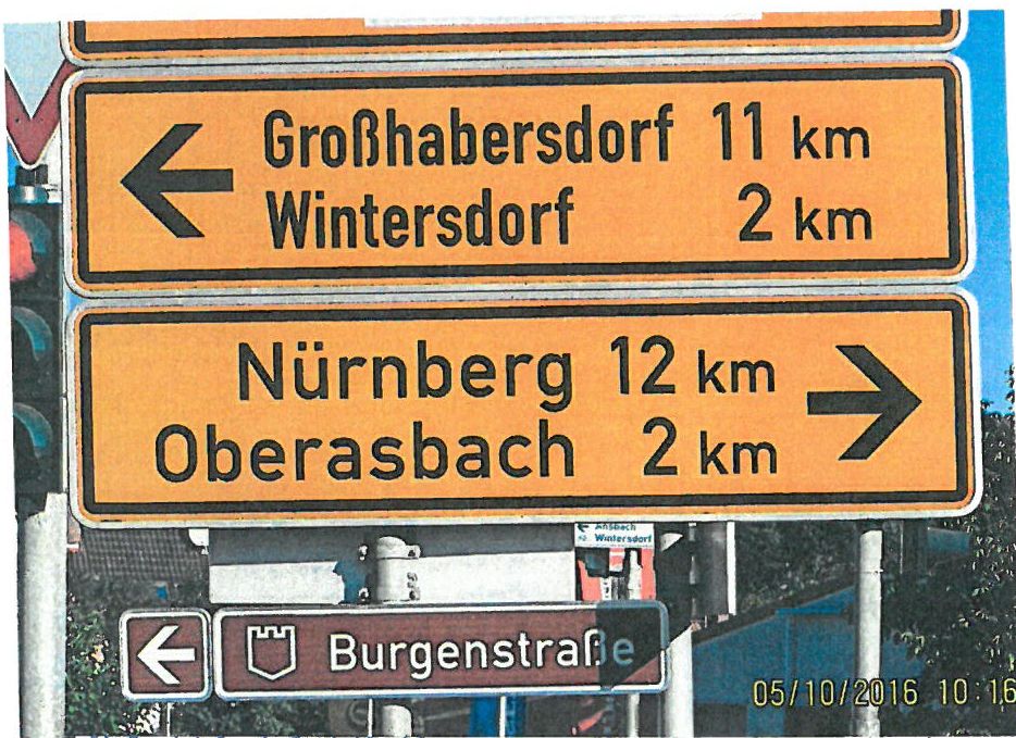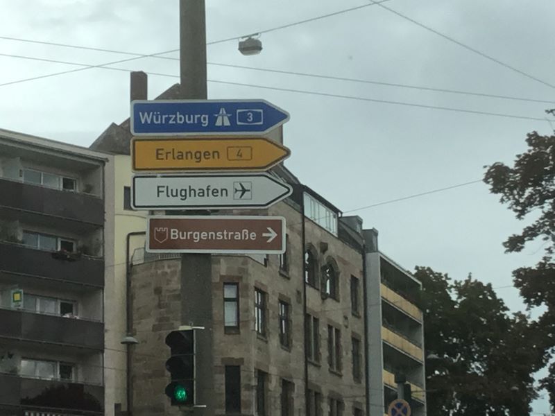 Großes Schild, Richtung Nürnberg, mit Linkspfeil