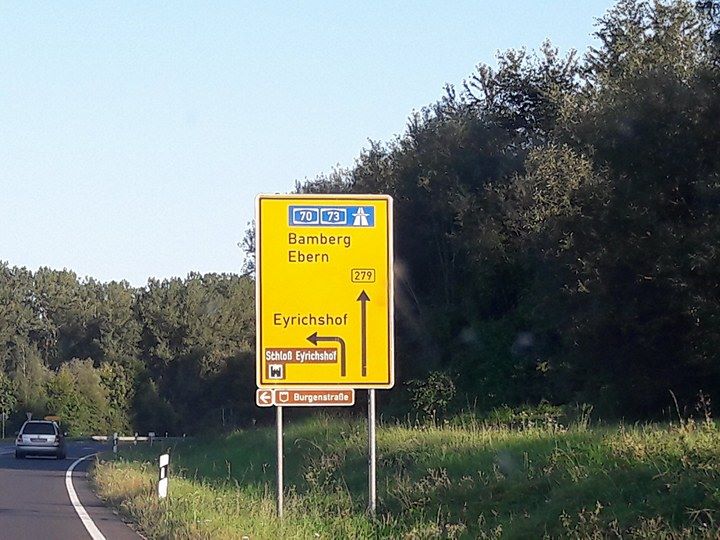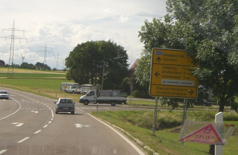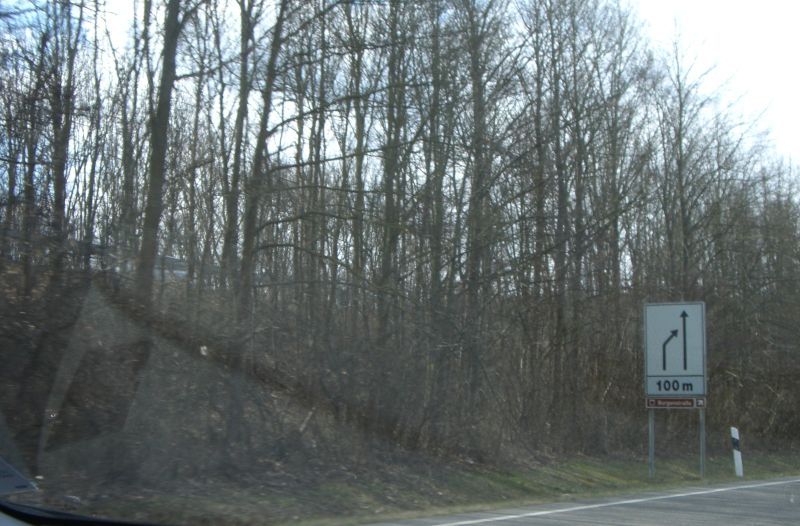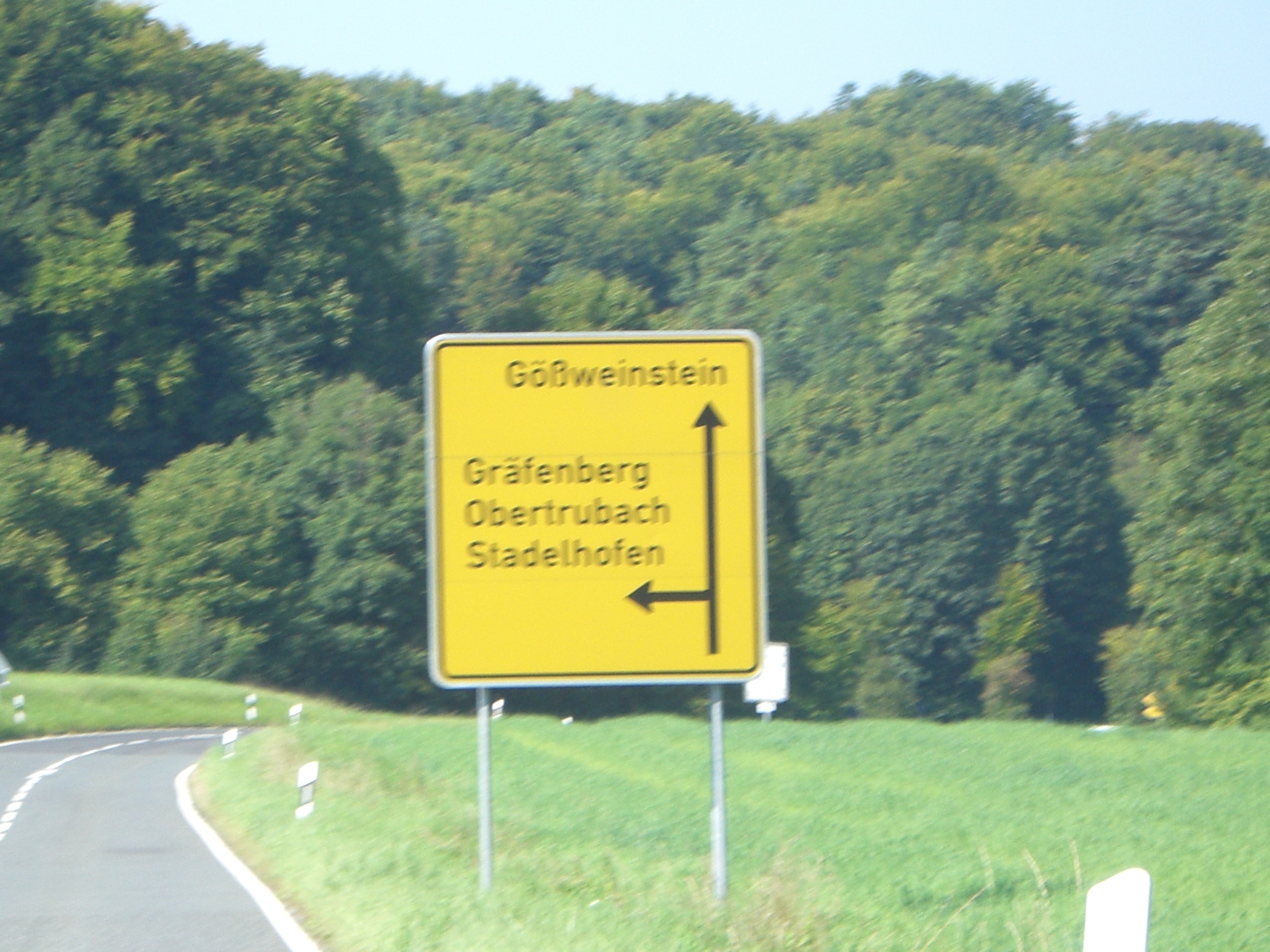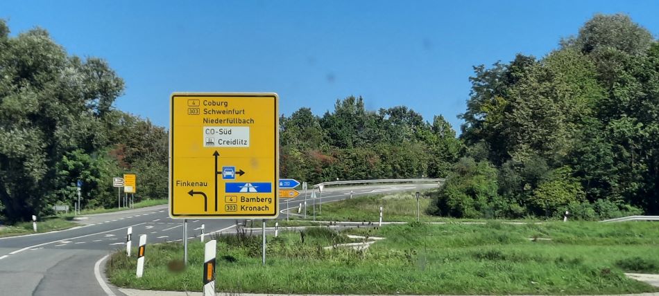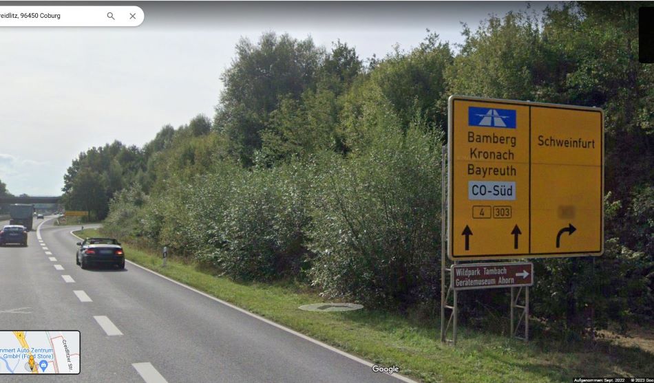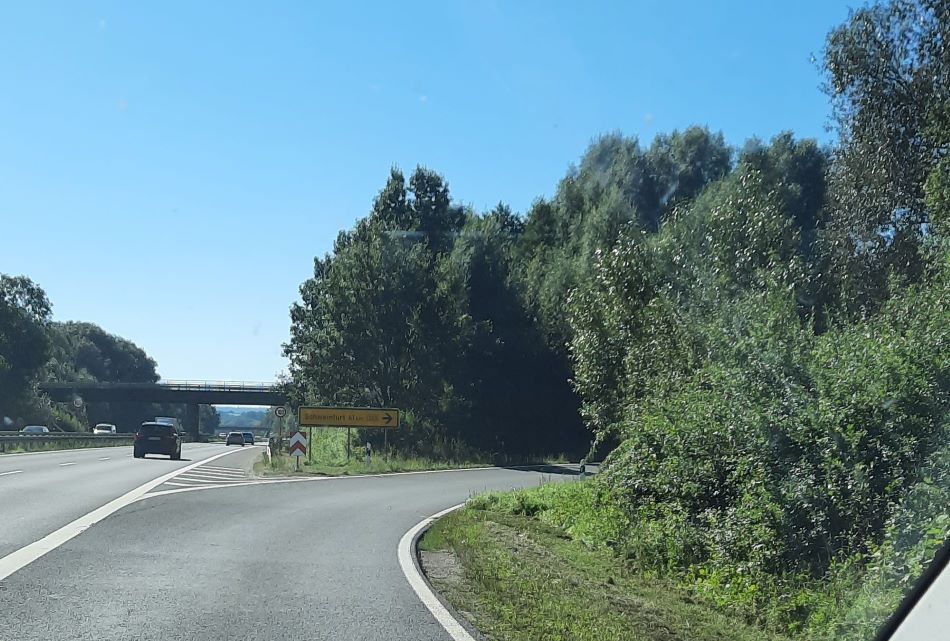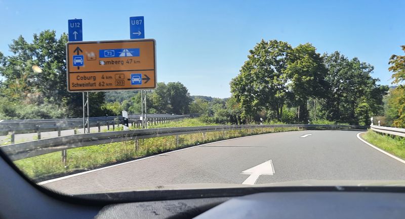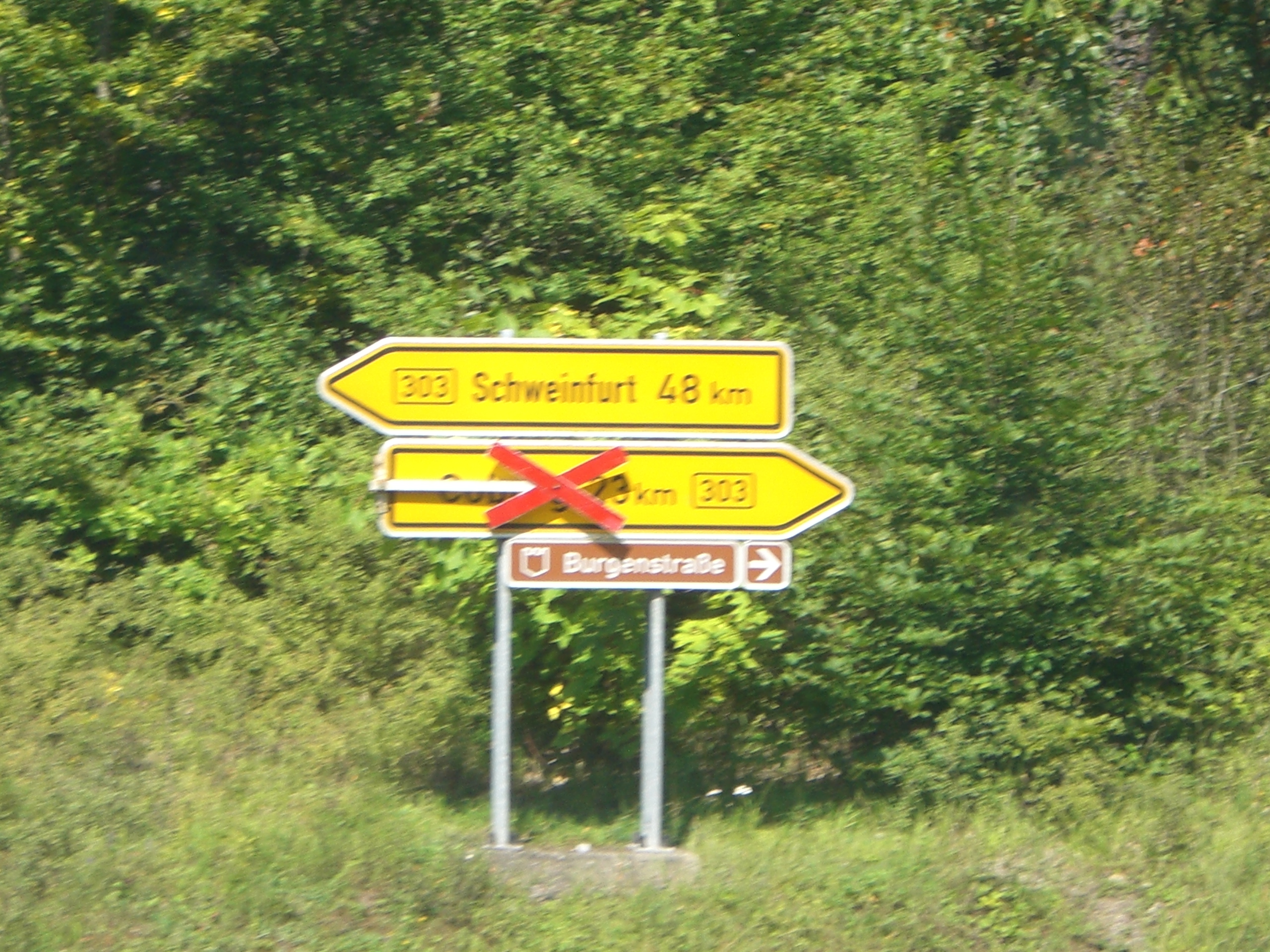 Standort: Abfahrt von B 4 auf B 303, unter/über dem rechtsweisenden Wegweiser "Schweinfurt 61 km"