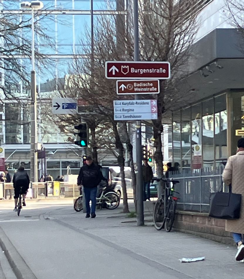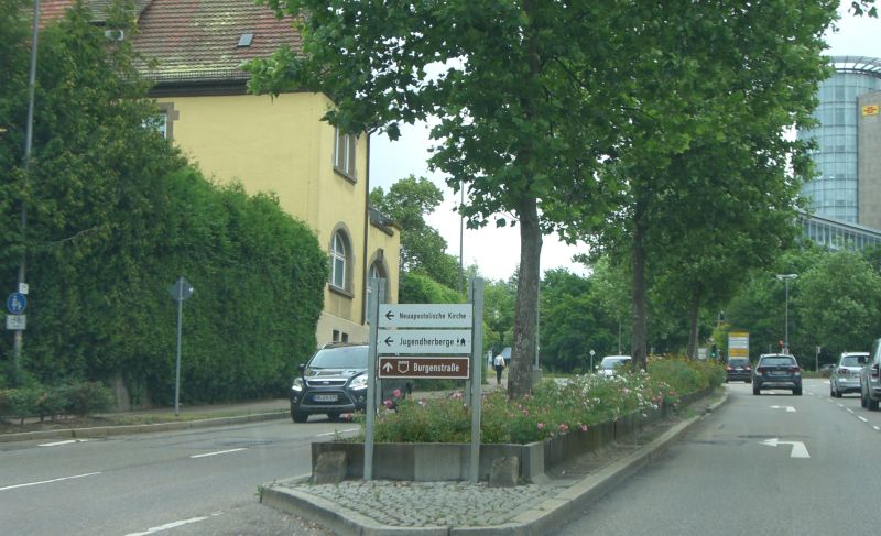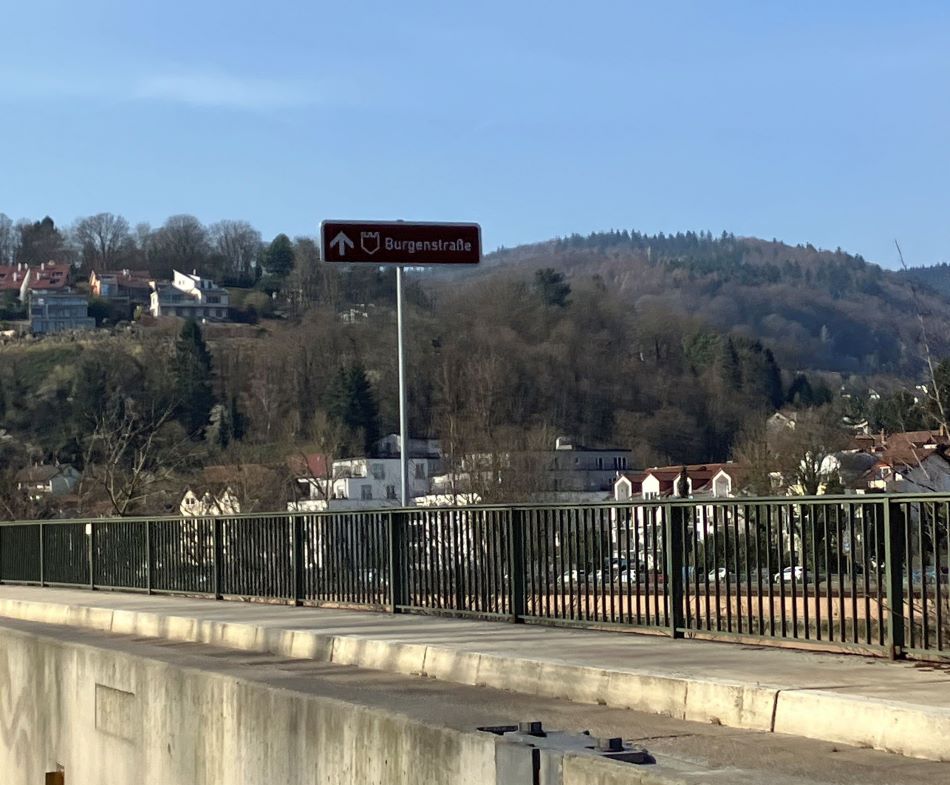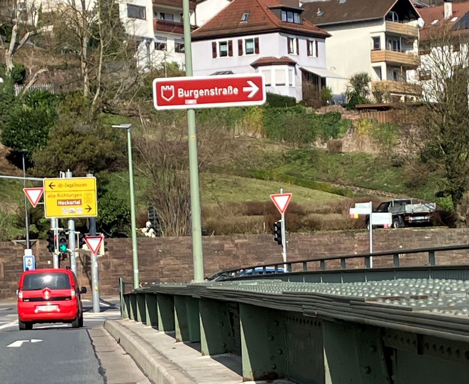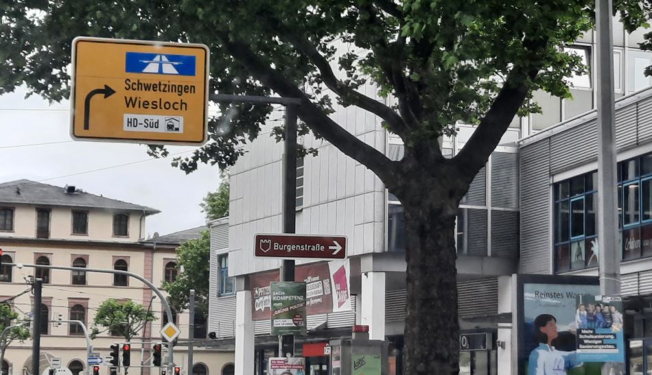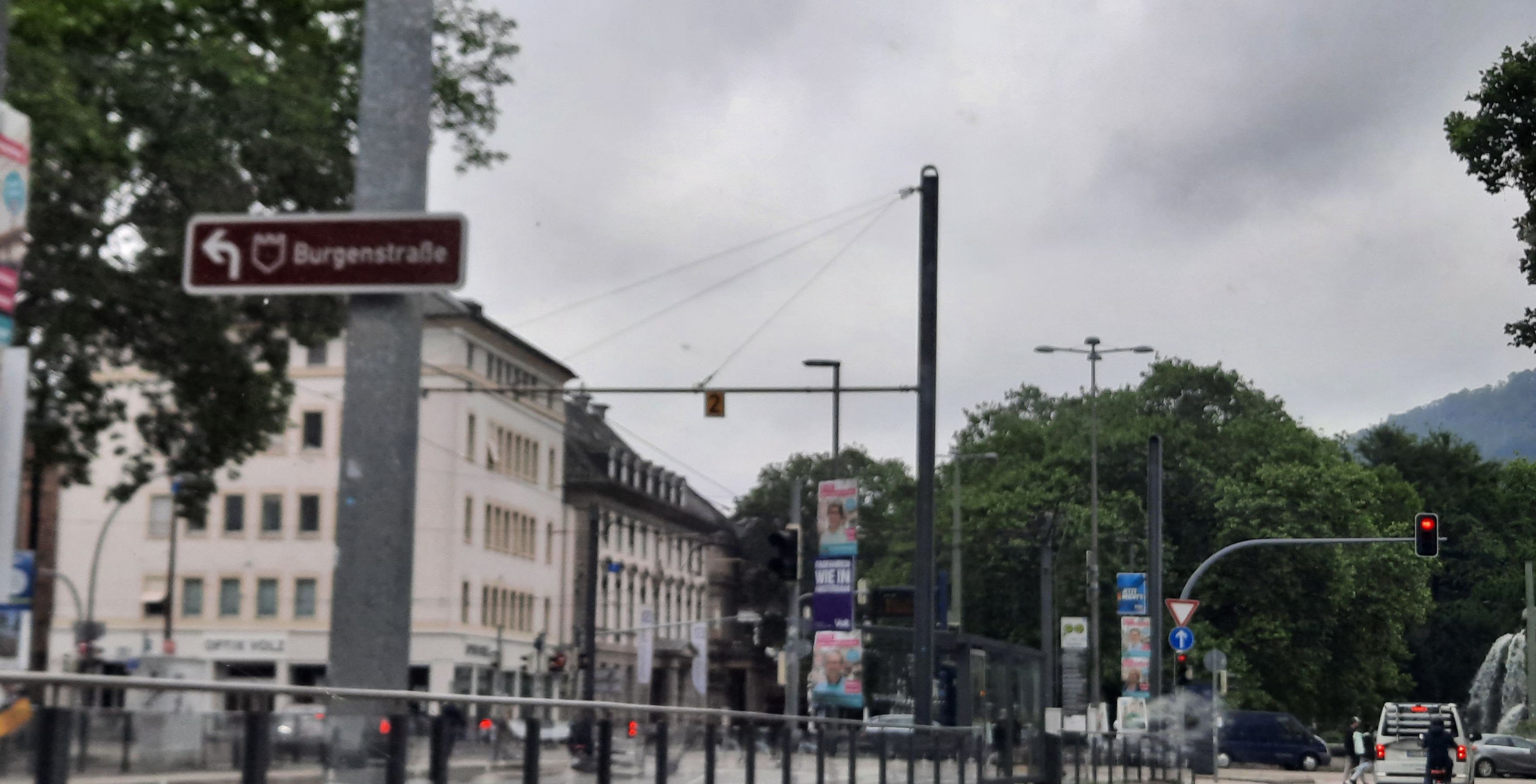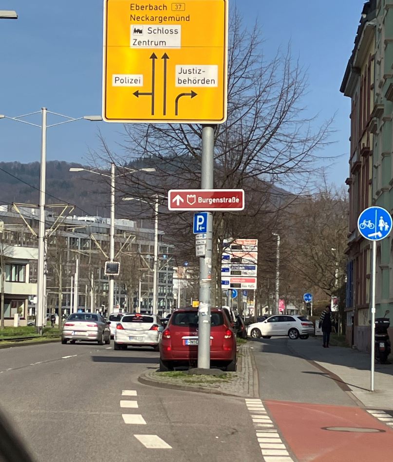 Standort: Ringstraße nach Einmündung Hildastraße, am Mast des Wegweisers Richtung Eberbach/ Neckargemünd/Schloss/Zentrum