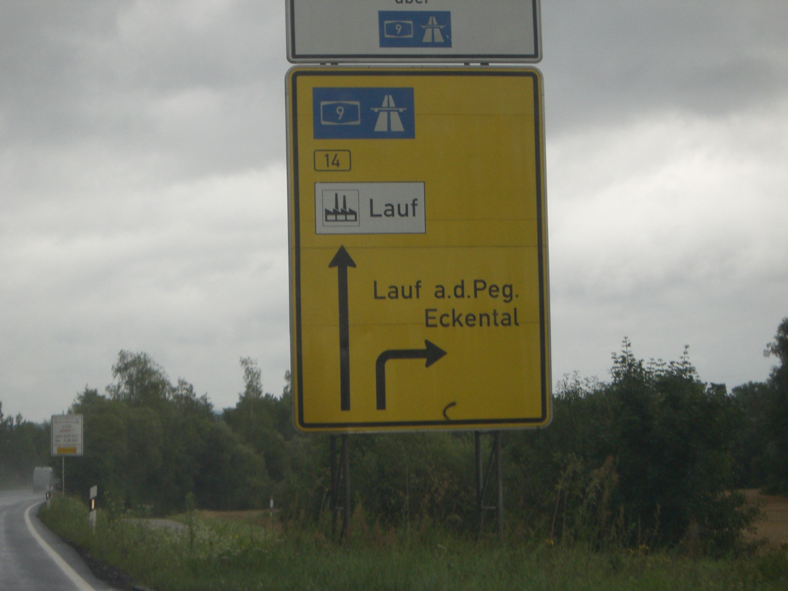 Standort: B 14, Abfahrt "Lauf a.d.Peg./Eckental", Aufkleber auf dem Vorwegweiser