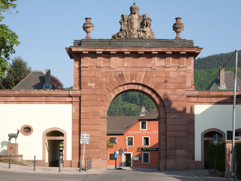 Die frühklassizistische Toranlage mit Amphoren und Wappenschmuck wurde zu Ehren des Kurfürsten Carl-Theodor von den Bürgern der Stadt Neckargemünd errichtet. Architekt war Hofkammerrat Dyckerhoff. Die Übersetzung der lateinischen Inschrift lautet:"Nicht zur Sicherheit der Stadt, sondern zum Ruhme des Kurfürsten Carl-Theodor von der Pfalz wurde das Tor erbaut; dem Pfälzer wie dem Fremden heilig; wird es die Jahre überdauern." Das in der Inschrift beinhaltetet Chronogramm nennt das Jahr der Fertigstellung 1788.