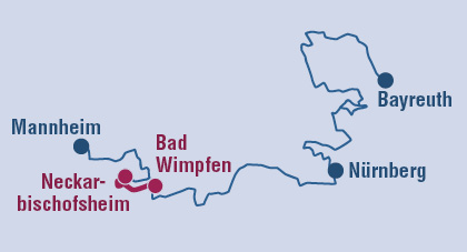 Mannheim - Heidelberg - Burg Hornberg - Burg Guttenberg - Bad Wimpfen - Schwäbisch Hall - Kirchberg an der Jagst - Rothenburg ob der Tauber - Ansbach - Nürnberg - Gößweinstein - Pottenstein - Bamberg