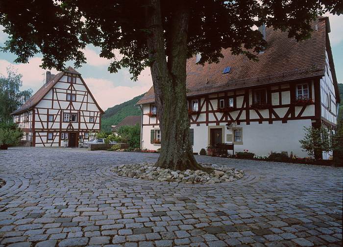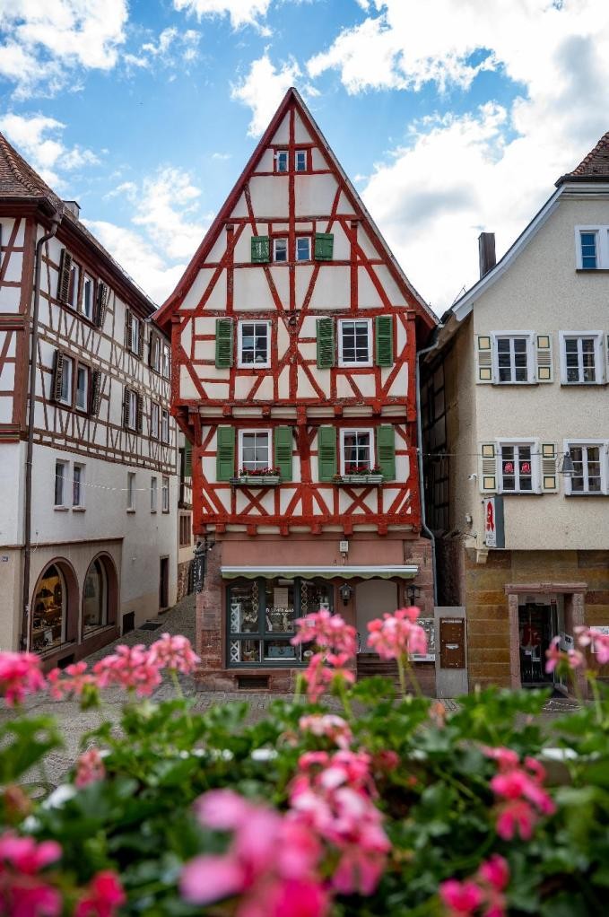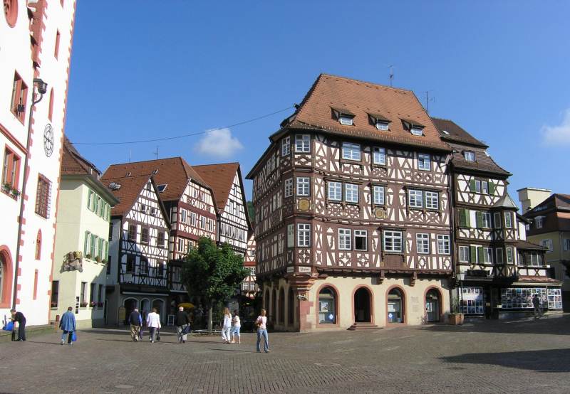 Die Fachwerkhäuser sind Ausdruck des Wohlstands der Stadt, das Rathaus in seiner heutigen Form aber das Ergebnis des pfälzischen Glaubenswechsels 1546. Die damals hier untergebrachte katholische Pfarrkirche Sankt Cäcilia, deren Anfänge vielleicht bis in das 9. Jahrhundert zurückreichen, wurde zum Abbruch freigegeben. Der größte Teil der Kirche wurde 1558 abgetragen und auf den erhaltenen Grundmauern das heutige Rathaus errichtet. Als Überrest des ehemaligen Kirchturms ist zum Beispiel das untere Drittel des Rathausturmes zu erkennen.