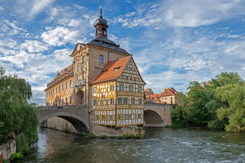 Das Alte Rathaus in Bamberg ist wahrlich ein Kuriosum: Ebenso erstaunlich wie seine Entstehungsgeschichte sind die Fresken, die die Fassade des Baus zieren. Der Sage nach wollte der Bischof von Bamberg den Bürgern keinen Platz für den Bau eines Rathauses gewähren. Deshalb rammten die Bamberger Pfähle in die Regnitz und schufen eine künstliche Insel, auf der sie das Gebäude errichteten. Bemerkenswert ist das Alte Rathaus vor allem durch seine Fresken, die der Fassade durch Scheinarchitektur Plastizität verleihen. Für Erheiterung sorgt dabei immer wieder ein besonderes Detail: Das Bein einer der Putten ragt als Skulptur aus den Wandfresken heraus. Heute beherbergt das Alte Rathaus den repräsentativen Rokokosaal und die Sammlung Ludwig.