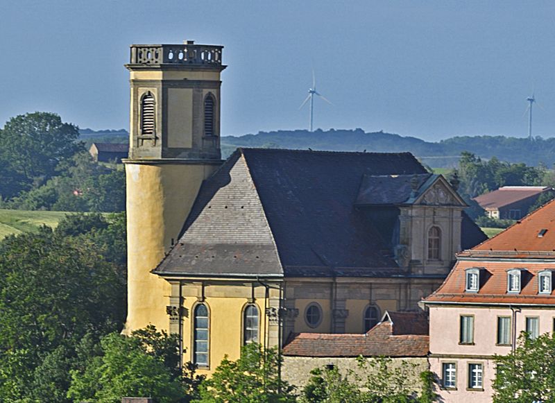 The tower of the protestant town church is one of the landmarks of the town silhouette. The church was built in 1730/31 by Count Friedrich Eberhard von Hohenlohe, the city wall on the south and west side served as the outer wall, the fortified tower as the church tower. The interior was designed in the Haller Baroque style with two galleries running all around and the altar, pulpit and organ arranged one above the other.