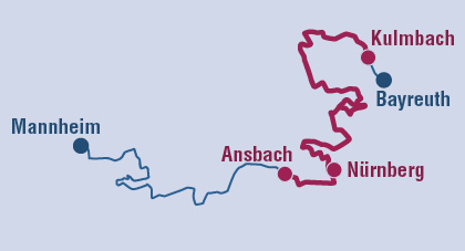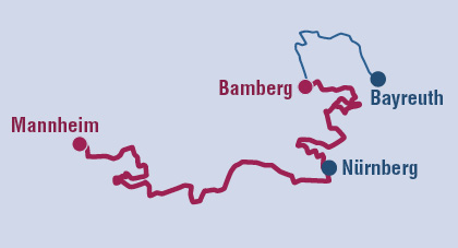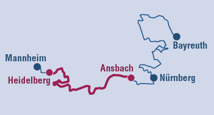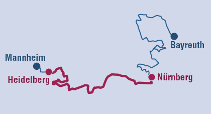 Mannheim - Heidelberg - Hornberg Castle - Guttenberg Castle - Bad Wimpfen - Schwäbisch Hall - Kirchberg an der Jagst - Rothenburg ob der Tauber - Ansbach - Nuremberg - Gößweinstein - Pottenstein - Bamberg