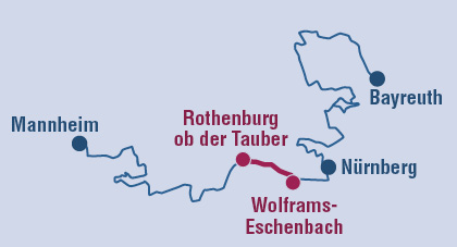 Two overnight stays in our premium partner hotels await you on this tour. You start in picturesque Rotheburg ob der Tauber, experience the Rococo magic in the former royal seat of Ansbach and finally get to know the hometown of the famous poet Wolfram von Eschenbach.