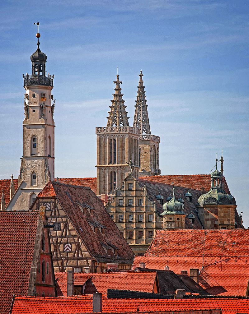 Rothenburg ob der Tauber is located on the Jacob's ways to Santiago de Compostela, so that every year more than 1000 pilgrims come to the Jacob's church. Inside, there are some special features to be discovered: one of the attractions is the impressive altar of the Holy Blood by Tilman Riemenschneider. The main altar, also known as the 12 messengers altar, was created by Friedrich Herlin and shows, among other things, the oldest representation of the Rothenburg market place. The Rieger organ is one of the largest in Bavaria and can be played on both sides, both towards the nave and the west choir. Throughout the year it can be heard in short, free organ concerts, during the Advent season in 30-minute concerts. Finally, the two towers of St. Jacob were built at different heights.